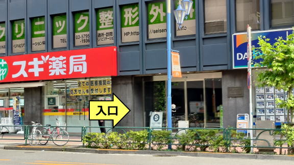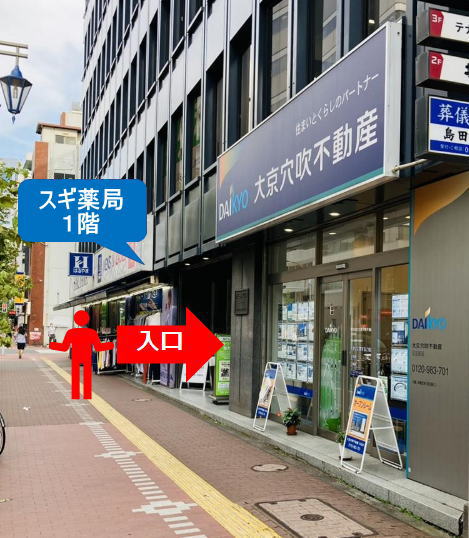 ★歩道橋を使わず平坦な道を利用 →東口を出て、駅を背にして左側へ歩き、駅前交番を背にしてロータリー横断歩道を渡る→右折して道なりに歩き、五反田東急スクエア前の横断歩道を渡る→横断歩道を2つ渡り、道なりに歩くと「大京穴吹不動産」が見えてきます。「スギ薬局」の手前がビルの入口エントランスです。 |