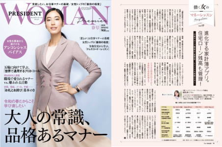 | 2020年03月31日 「プレジデントウーマン」(プレジデント社)2020年3月春号「働く女のマネーレッスン」~家計簿アプリの賢い利用法~が誌面掲載されました。 |