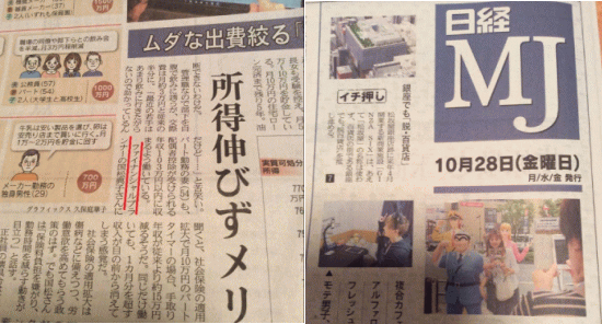 | 2016年10月28日 日経MJ新聞の第一面記事に取材掲載いただきました。所得が伸びない中での、パート社保適用拡大についてコメントさせていただきました。 |
