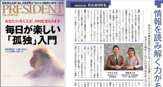 | 2019年03月04日 PRESIDENT資産運用特集「人生100年時代のライフデザイン」として株式会社クレド代表取締役小松圭太氏との対談が掲載されました。 |