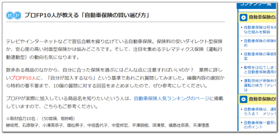 | 2015年09月15日 FPプロ10人が教える「自動車保険の賢い選び方」に執筆協力いたしました。 http://hokensc.jp/jidousha/osusume.html |