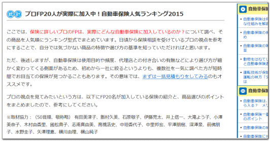 自動車の教科書「プロFP20人が実際に加入中!自動車保険人気ランキング2015 」