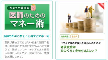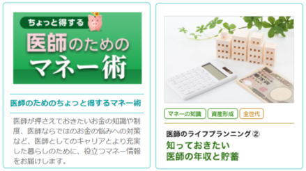 | 2019年05月10日 サノフィ製薬「医師のためのちょっと得するマネー術」第2回目。今回のテーマは医師のライフプランニング「知っておきたい医師の年収と貯蓄」が掲載されました。 医師が押さえておきたいお金の知識や制度、医師ならではのお金の悩みへの対策など、医師としてのキャリアとより充実した暮らしのために役立つマネー情報を定期的にお届けしています。 https://e-mr.sanofi.co.jp/useful/money |