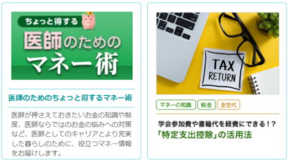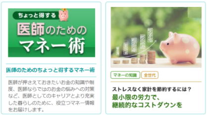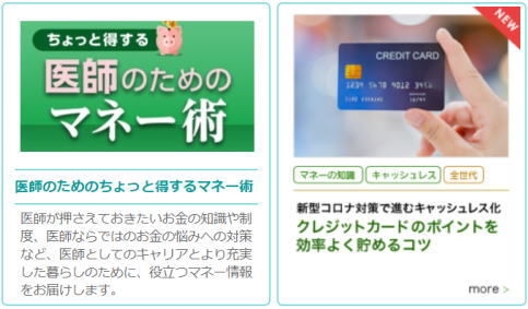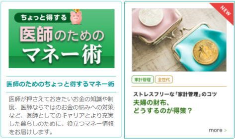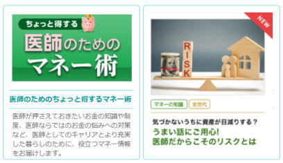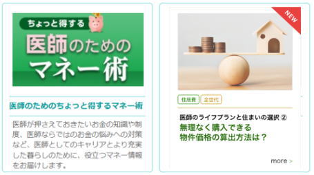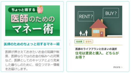 | 2020年03月20日 サノフィ製薬「医師のためのちょっと得するマネー術」第10回目。今回のテーマは「医師のライフプランと住まいの選択①~住宅は賃貸と購入どちらがお得?~」が掲載されました。 医師が押さえておきたいお金の知識や制度、医師ならではのお金の悩みへの対策など、医師としてのキャリアとより充実した暮らしのために役立つマネー情報を定期的にお届けしています。 https://e-mr.sanofi.co.jp/useful/money |