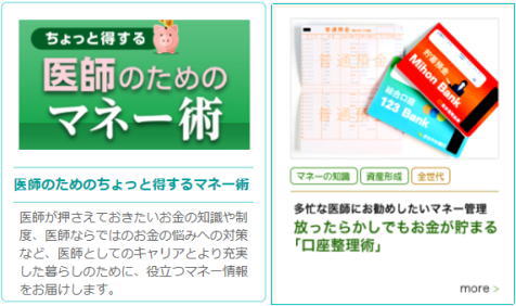 | 2019年09月20日 サノフィ製薬「医師のためのちょっと得するマネー術」第5回目。今回のテーマは「多忙な医師にお勧めしたいマネー管理術 放ったら菓子でもお金が貯まる講座管理術」が掲載されました。 医師が押さえておきたいお金の知識や制度、医師ならではのお金の悩みへの対策など、医師としてのキャリアとより充実した暮らしのために役立つマネー情報を定期的にお届けしています。 https://e-mr.sanofi.co.jp/useful/money |