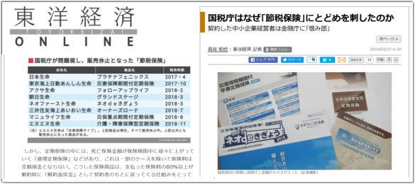 | 2019年03月27日 東洋経済ONLINE『国税庁はなぜ「節税保険」にとどめを刺したのか』記事取材協力いたしました。 |