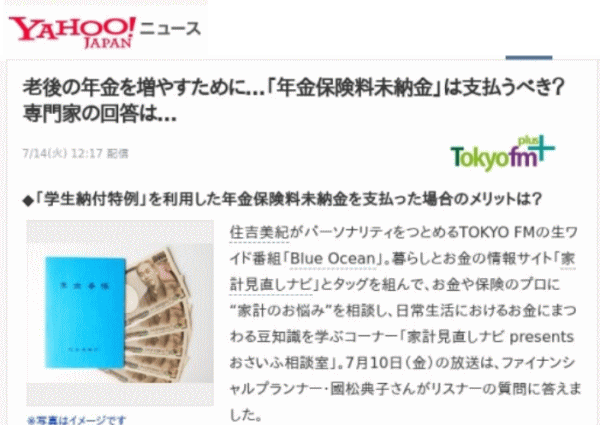 | 2020年07月14日 ヤフーニュースに掲載いただきました。 住吉美紀がパーソナリティをつとめるTOKYO FMの生ワイド番組「Blue Ocean」日常生活におけるお金にまつわる豆知識を学ぶコーナー「家計見直しナビ presents おさいふ相談室」。7月10日(金)の放送内容がWEBニュース掲載されました。「老後の年金を増やすために…年金保険料未納金は支払うべき?」 |