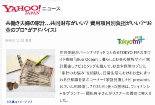| 2020年08月04日 ヤフーニュースに掲載いただきました。 住吉美紀がパーソナリティをつとめるTOKYO FMの生ワイド番組「Blue Ocean」日常生活におけるお金にまつわる豆知識を学ぶコーナー「家計見直しナビ presents おさいふ相談室」。7月31日(金)の放送内容がWEBニュース掲載されました。「共働き夫婦の家計…共同財布がいい?費用項目別負担がいい?”お金のプロ”がアドバイス!」 |