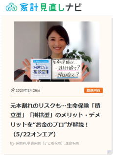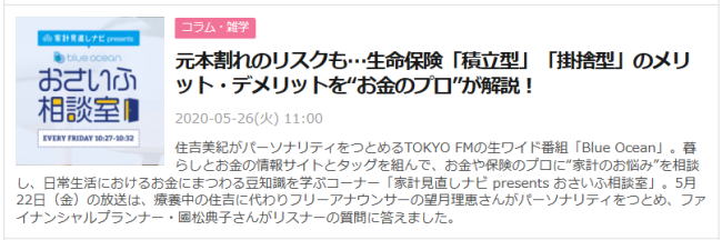 | 2020年5月22日 10:30〜 TOKYO FMの生ワイド番組「住吉美紀のBlue Ocean」家計見直しナビ presents ”おさいふ相談室”に出演いたしました。ヤフーニュースにも掲載されました。 |