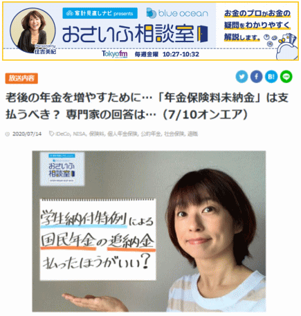 | 2020年7月10日 10:30〜 TOKYO FMの生ワイド番組「住吉美紀のBlue Ocean」家計見直しナビ presents ”おさいふ相談室”に出演いたしました。「老後の年金を増やすために…「年金保険料未納金」払うべき?専門家の回答は」についてお話させていただきました。 |