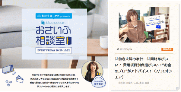 | 2020年7月31日 10:30〜 TOKYO FMの生ワイド番組「住吉美紀のBlue Ocean」家計見直しナビ presents ”おさいふ相談室”に出演いたしました。「共働き夫婦の家計…共同財布がいい?費用項目別負担がいい?”お金のプロ”がアドバイス!」お話させていただきました。 |