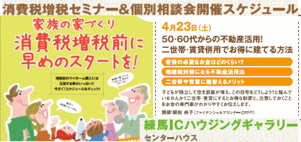 | 2016年4月23日(土)11:00~12:00 練馬ICハウジングギャラリーにてセミナー「50・60代からの不動産活用!二世帯・賃貸併用でお得に建てる方法」●老後の必要なお金はどのくらい? ●相続税対策になる不動産活用法 ●二世帯や賃貸に建替えるメリット 子どもが独立して空き部屋が増え、この自宅をどうしよう?と悩んでいませんか?二世帯・賃貸にするとお得な制度と、注意しておくことをお金の専門家がわかりやすくお伝えしました。 ![]() |
