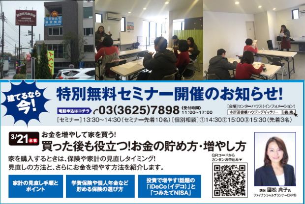 | 2018年 3月21日 「お金を増やして家を買う!~買った後も役立つ!お金の貯め方・増やし方~」セミナー講師を務めさせていただきました。 (主催:本所吾妻橋ハウジング in:本所吾妻橋ハウジングギャラリー) ●家計の見直し手順とポイント ●学資保険や個人年金など貯める保険の選び方 ●投資で増やす!話題の「iDeCo」と「つみたてNISA」 |