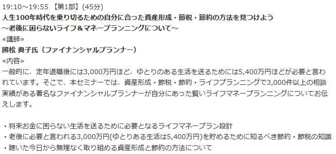「人生100年時代を乗り切るための自分に合った資産形成・節税・節約の方法を見つけよう~老後に困らないライフ&マネープランニングについて」セミナー