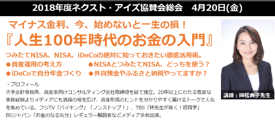 | 2018年 4月20日 『~マイナス金利、今、始めないと一生の損!「人生100年時代のお金の入門」』基調講演会講師を務めさせていただきました。 (主催:ネクスト・アイズ株式会社協賛会) |
