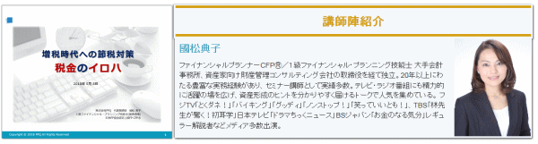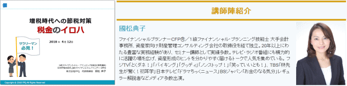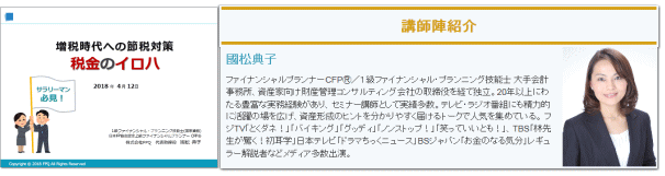 | 2018年5月 30日 『増税時代への節税対策、税金のイロハ』セミナー講師を務めさせていただきました。 (主催:株式会社リフレクトプロパティ) |