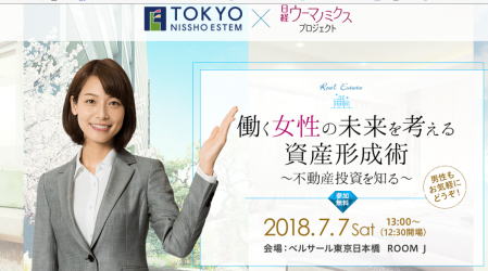 | 2018年 7月 7日 「働く女性の未来を考える資産形成術~不動産投資を知る~」セミナー講師を務めさせていただきました。 (主催:株式会社東京日商エステム in:日経ウーマノミクス・プロジェクト) |
