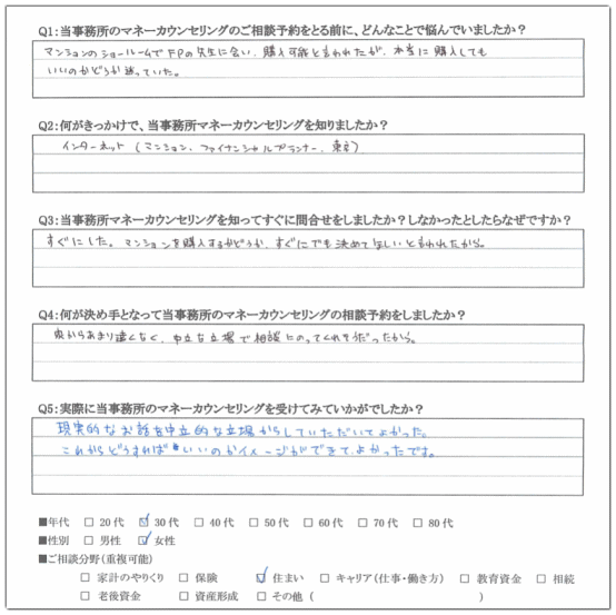 「マンションのショールームでFPの先生に会い、購入可能と言われたが、本当に購入してもいいのかどうか迷っていた。」