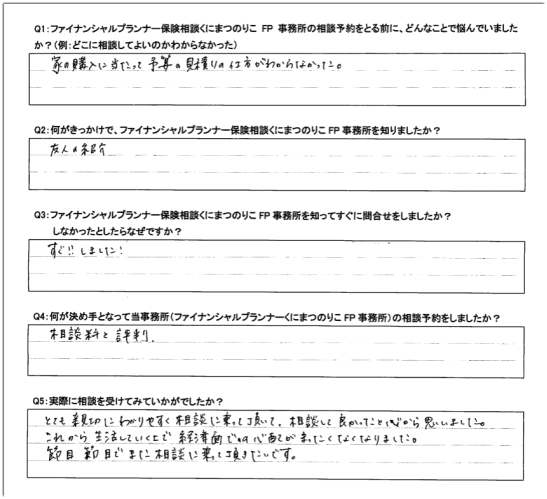 「とても親切にわかりやすく相談に乗って頂いて、相談して良かったと心から思いました。これから生活していく上で、経済面での心配がまったくなくなりました。節目節目でまた相談に乗っていただきたいです。」