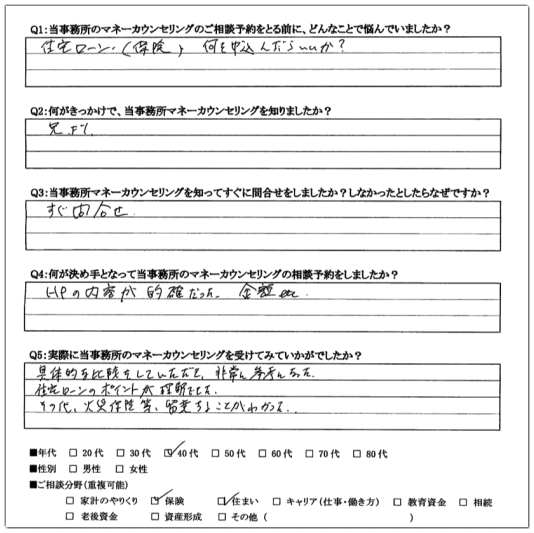 「住宅ローンについては、知りたいポイントが明確になって良かった。説明もとても分かりやすく、親身に相談に乗っていただけた。」