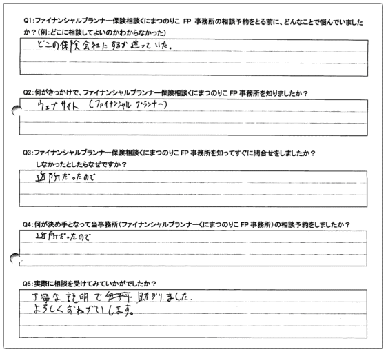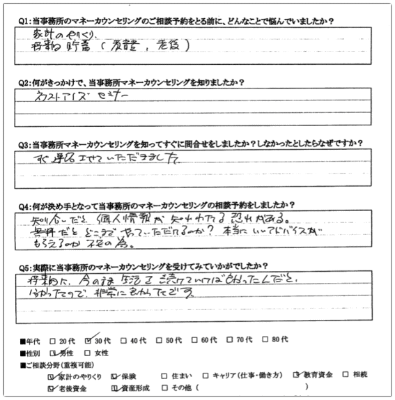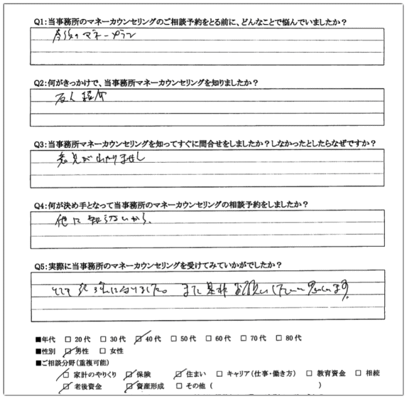 「様々な視点(収入、家族構成、保険など)でライフプランに関するアドバイスをもらえて非常に良いと思いました。いろんな知識も増え、自分の将来の不安がなくなってきて安心感が増えました。」