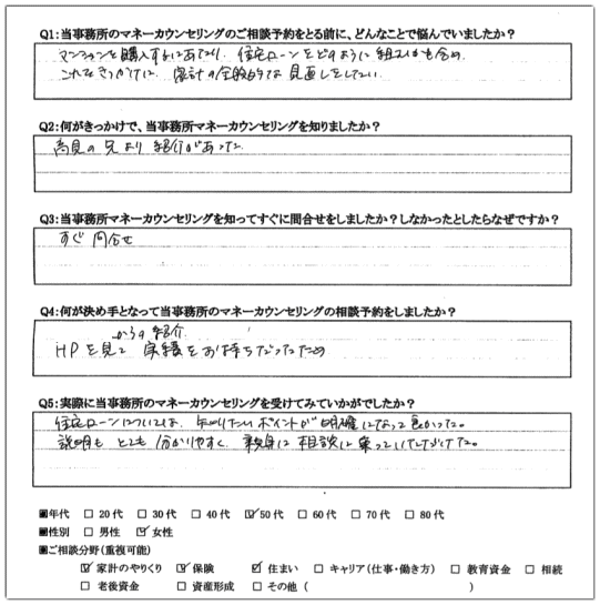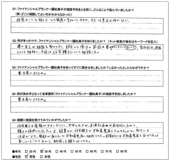 「住宅購入は金額も大きいだけに、不安もあったが、返済計画が具体的にわかり、購入の後押しになった。又、経費など住宅購入で不動産業者にまかせるしかない部分にも注目ができ、無駄が省けないか不動産業者に相談できた。結果的には不動産業者も削れる所は削っていることがわかり、納得した購入ができた。」