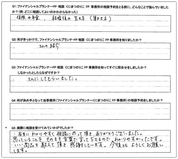 「本当にわかりやすく相談にのっていただき、ありがとうございました。思っていることを、そのまま言葉で言って下さるので、わかりやすかったです。いい商品を教えて頂き感謝しています。今後ともよろしくお願いします。」