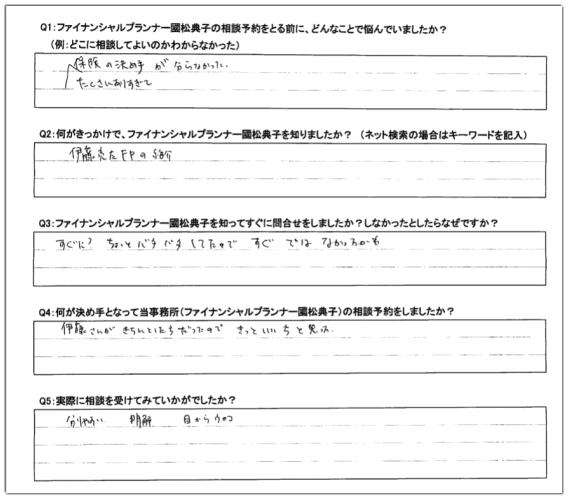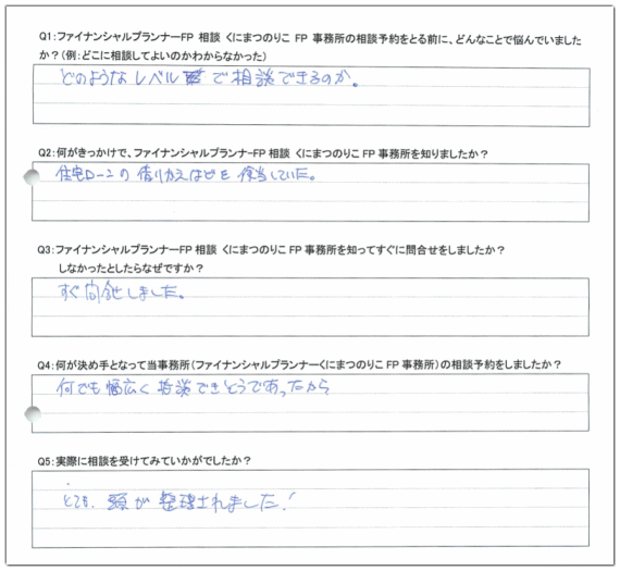 「初めにご相談した時もそうでしたが、2回目にローンの件でご相談した時も漠然と不安に思っている事がクリアーになって、安心しました。ご相談した後も、メールでアドバイスを頂き、家の購入という大きな買い物も後悔せずに勧めることができました。」
