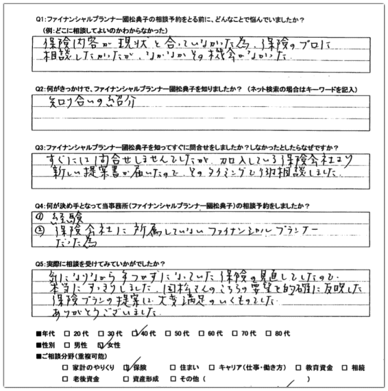 「気になりながら手つかずになっていた保険の見直しでしたので、本当にすっきりしました。国松さんのこちらの要望を的確に反映した保険プランの提案に大変満足のいくものでした。ありがとうございました。」