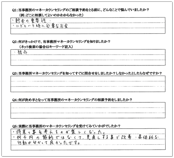 「将来の事を考えるのが楽しくなった。何千円の節約ではなくて、見直しする事で改善・具体的な行動が分かって良かったです。」