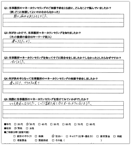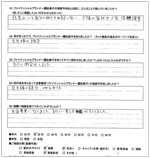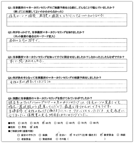 「独立系のファイナンシャルプランナーの方のカウンセリングは、住宅ローンの見直しでも幅広い選択肢から提案してくださり、最適な借りかえができそうです。主婦目線で女性のキャリア(働き方)について、アドバイスをいただき、大変参考になりました。保険業の夫も納得するカウンセリングでした。」
