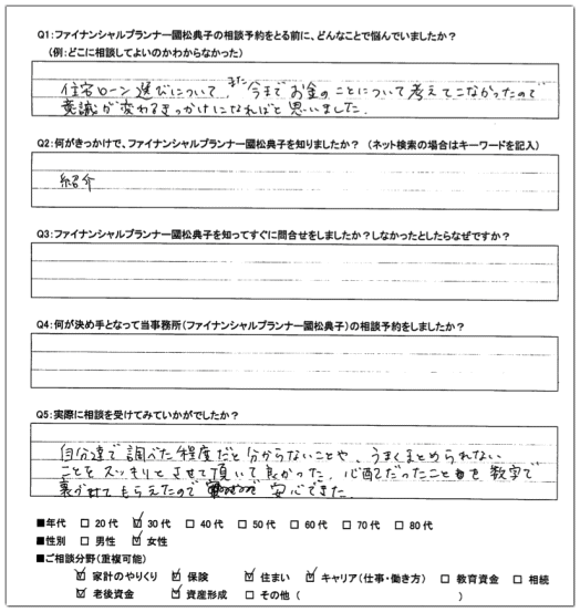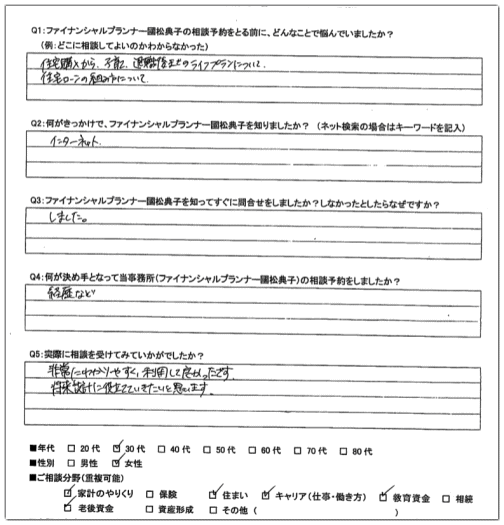 「色々なパターンを想定してシミュレーションしていただいて、とても分かりやすかったです。これからどうしていけば、家計が回せていけるかというのが分かり、将来に対する漠然とした不安が軽くなったように思います。FPの先生のお話を聞くというのは初めてで、敷居が高かったのですが、今回若い段階でお話が聞けてよかったです。ありがとうございました。」
