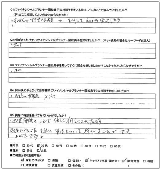 学資保険のことでくわしく伺えてよかったです。生涯にわたったお金の管理について考えることができよかったです。」