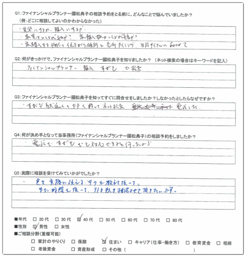 「住宅ローンの組み方をどのようにしたらよいか。ライフプランをどのように立てればよいか。専門家のお話を聞きたかった。」
