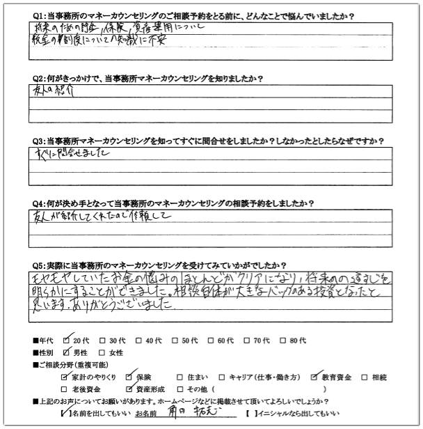 「モヤモヤしていたお金の悩みのほとんどがクリアになり、将来への道すじを明らかにすることができました。相談自体が大きなバックのある投資となったと思います。ありがとうございました。」