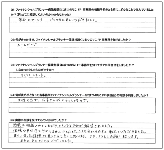 「実際に相談させていただきいろいろな不安が解消されました。保険の事は全く分かりませんでしたが、とても分かりやすく教えていただきました。自分に合った保険が見つかると良いと思います。またよろしくお願い致します。本当にありがとうございました。」