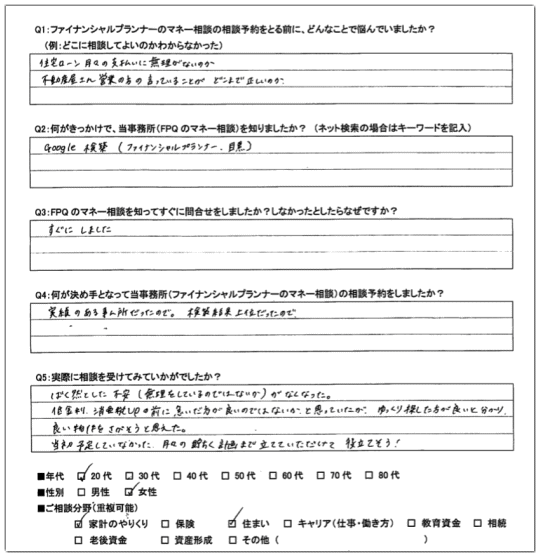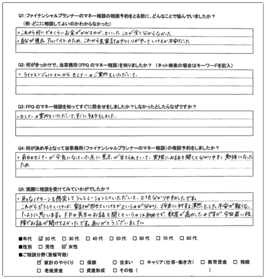 「色々なパターンを想定してシミュレーションしていただいて、とても分かりやすかったです。これからどうしていけば、家計が回せていけるかというのが分かり、将来に対する漠然とした不安が軽くなったように思います。FPの先生のお話を聞くというのは初めてで、敷居が高かったのですが、今回若い段階でお話が聞けてよかったです。ありがとうございました。」