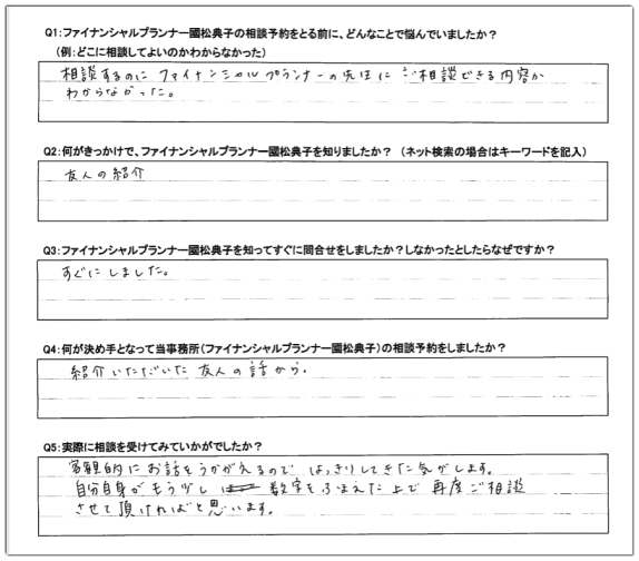 「とても親身に話を聞いて下さり、また豊富な経験談、相談事例を教えて頂き、大変参考になりました。人生の大事な決断を感情やそのときの思い付きで決めるのではなく、きちんとしたシミュレーション、数字の根拠を基に判断できたのがとてもよかったです。」